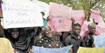Imagem: Manifestantes protestam em Chibok, na Nigéria, com cartazes pedindo a volta das mais das mais de 200 meninas raptadas de uma escola local pelo grupo terrorista Boko Haram