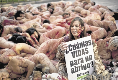 - Ativistas da organização AnimaNaturalis em um protesto nu na Espanha, ...